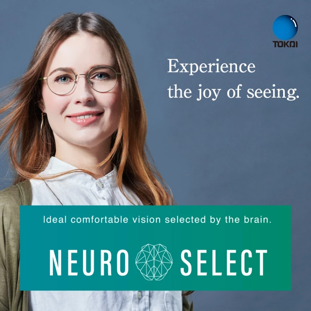 Tokai’s Neuro Select is a neuroscience-driven progressive lens family developed with magnetoencephalography (MEG) data to optimize how the brain perceives clarity, especially in peripheral vision. Combined with personalized fitting and lifestyle-specific designs, it reduces blur, sway, and adaptation stress while offering tailored options for different visual needs.